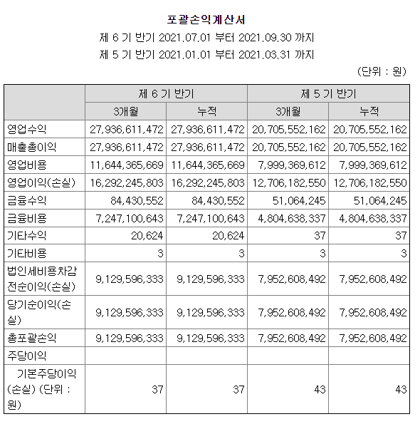 지난 제 5기 반기에 비해 매출과 영업이익이 안정적으로 증가하고 있음을 확인할 수 있습니다.