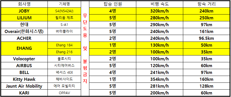 상기 표에서 노란색 음영 표시한 3개 회사만 시험비행을 완료했습니다.