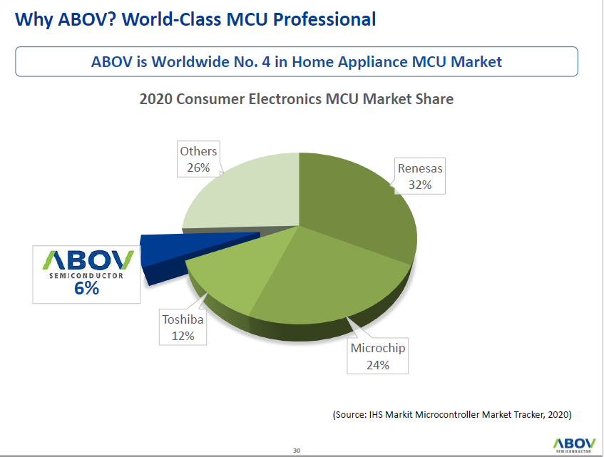 Global MCU 시장에서 어보브반도체(ABOV)의 점유율은 6%입니다.
