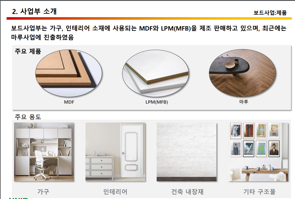 - 보드사업 부분(24.90%): MDF 등 (가구, 내장재, 포장재, 건축자재, 파렛트 용도)