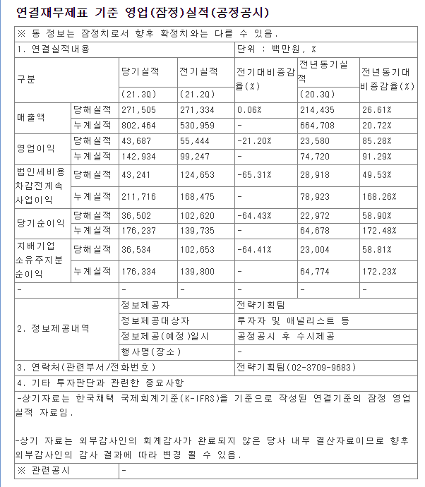 잠정실적 발표는 매출: 2,715억 원, 영업이익: 436억, 순이익: 365억입니다.