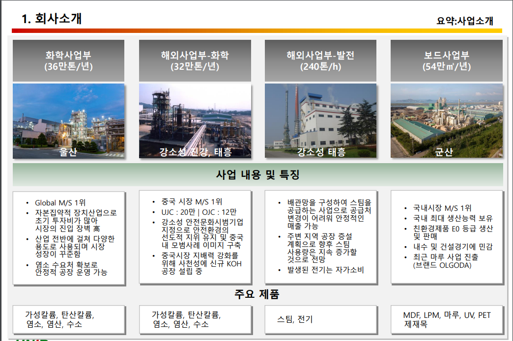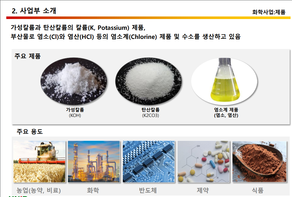 - 화학사업 부분(67.38%): 가성칼륨 등 (SBR, ABS, 반도체, 의약, 세제, 태양광 웨이퍼 식각 용도)