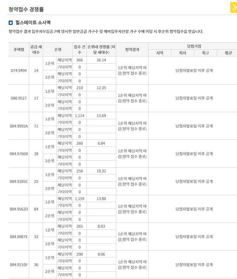 - 84A (71세대) - 경쟁률 15.69 추첨제 경쟁률: 58.94 분양가: 745,000,000~851,000,000